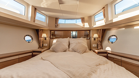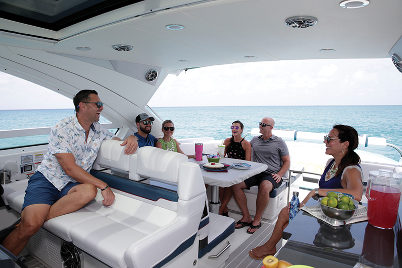 Fast paced, yet solid and secure, treat your guests to performance and luxury with sumptuously contoured cockpit seating that sports crisp, precision stitching, flowing colour accents and recessed lumbar areas. The 400’s SmartZone design utilizes every square inch for uninterrupted entertainment. Two distinct lounge areas, the spacious U-shape to starboard and the portside divan, offer versatile spaces for lunch, basking in the sun or enjoying a sunset cruise.