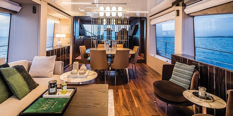 Ferretti Yachts 860 has been built for an owner who loves her eye-catching contemporary design and the versatile interiors and exteriors, all combined with a superb cruising experience. The Classic Mood version translates into warmer, darker colours with bold contrasts that highlight the impressive size but light touch of a yacht featuring maximum continuity between exteriors and interiors, pointed up by the opening window at starboard.