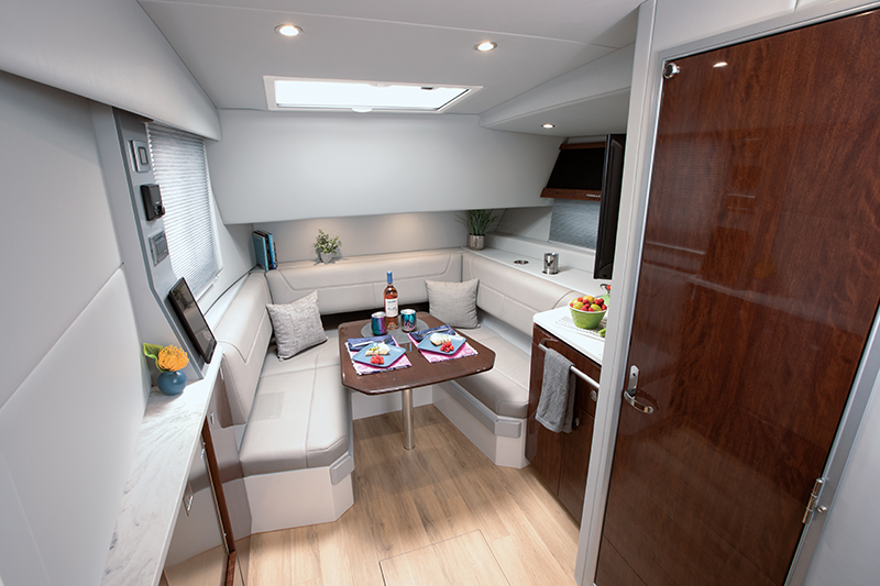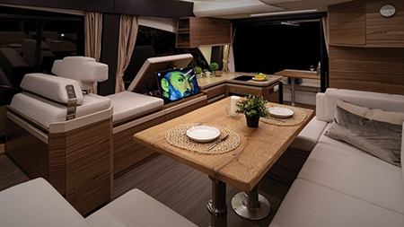 Below deck, U-shaped dinette seating replaces L-shaped furniture. Amidships, the full-beam master stateroom’s starboard sofa can now be swapped with a sideboard. Freshwater capacity benefits from a modest bump for longer, lingering showers. A solid-surface sink replaces the stainless-steel sink.