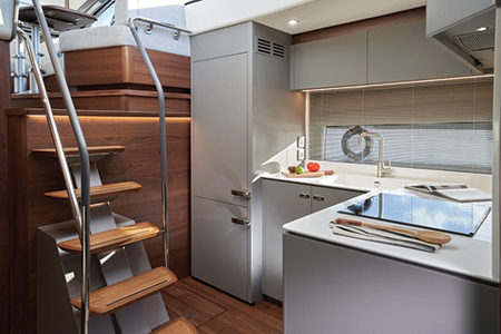 The starboard side lower kitchen is beautifully presented. Culinary conveniences include a spacious sink with a premium folding swivel spout and glide-away cover, and an overhead microwave. A hardwood dovetailed drawer with automatic silent closure and spacious open and concealed cupboard space. The 32” LED/LCD HDTV with Blu-ray is positioned to entertain guests. Chartplotter and available iPad connectivity with the stereo upgrade puts control in your hands.