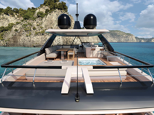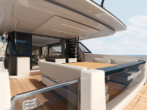 The result of collaboration between the product strategy committee led by Mr. Piero Ferrari and the Ferretti Group engineering department, Ferretti Yachts 860 is the third yacht developed by architect Filippo Salvetti (exterior design) and Ideaitalia (interiors).