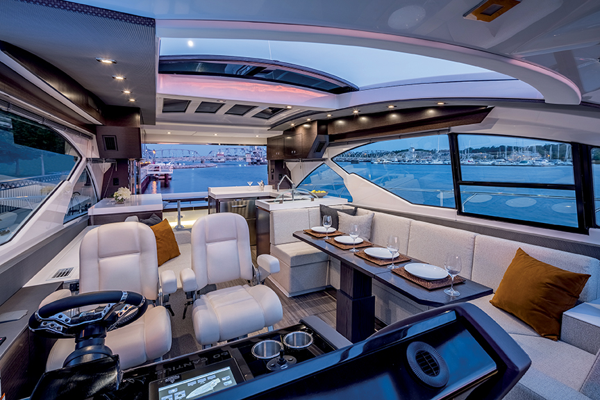 The cockpit is something that you expect to see only in a movie. With a 360° view, there is no bad seat in the house. Open the sunroof or expose the skylights for additional light and air. The port side dinette across from the helm station comfortably seats four.