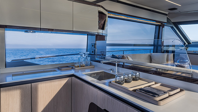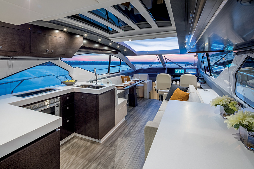 Stepping inside the cabin, the first thing that stands out is the glass stairway to the bridge. Wrapped in all stainless steel, these steps are open, clear and create an open-air feeling while adding functionality. The 360° view from the windows doesn’t make you feel like you are inside. The galley has a nice six-person glass dining table on the starboard side and immediate to the port is the galley that will make most home kitchens envious.
