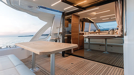 The 45 Fly is dressed up with solar panels that produce 8 kW/h per day with the 600 W standard array, with an optional hard-top setup to bump up production to 1,200 W. The full beam Flybridge superstructure expands over the entire width of the yacht, making it the largest in its class.