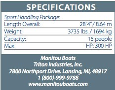 The cornerstone of the Sport Handling Package (SHP) model is its increased handling and performance. Instead of the standard two pontoons, there are three pontoons. The central pontoon is larger than the outer ones which creates a V-shaped underwater profile. This shape, known as deadrise, allows much greater handling and increased ability to deal with waves and choppy conditions. Additionally, each pontoon has lifting strakes which help the boat get up and go as quickly as possible. To handle this, each Sport Handling Package equipped boat comes with SeaStar Power Assist Hydraulic Steering to ensure great control at all speeds. SHP boats are also structurally enhanced to handle any extra stresses or strain that may be present, to help ensure the quality and longevity that is expected from Manitou pontoon boats.