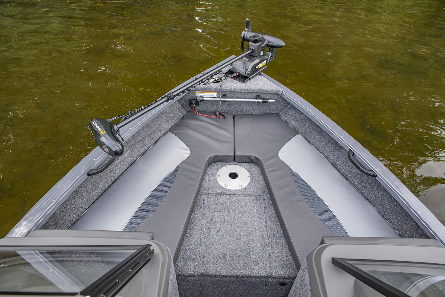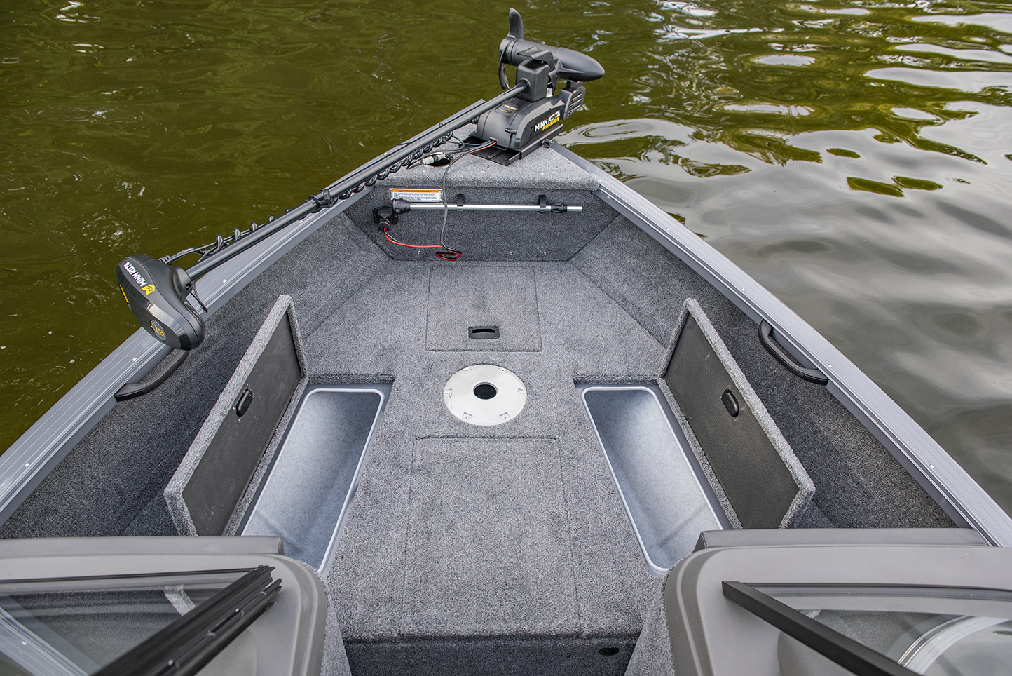 Looking at the bow, in the starboard side floor you have a cooler while you have a 30-inch 17 gallon live well on the port. There is also anchor storage in the middle towards the bow.  Just aft of the anchor storage is additional storage and access to your trolling motor battery. Standard with a 12V Minn Kota, you can option for the 24-volt motor if you prefer. The casting platform overall is spacious and easy to access.  The bow cushion option is a must have if you plan on using the boat for pleasure.