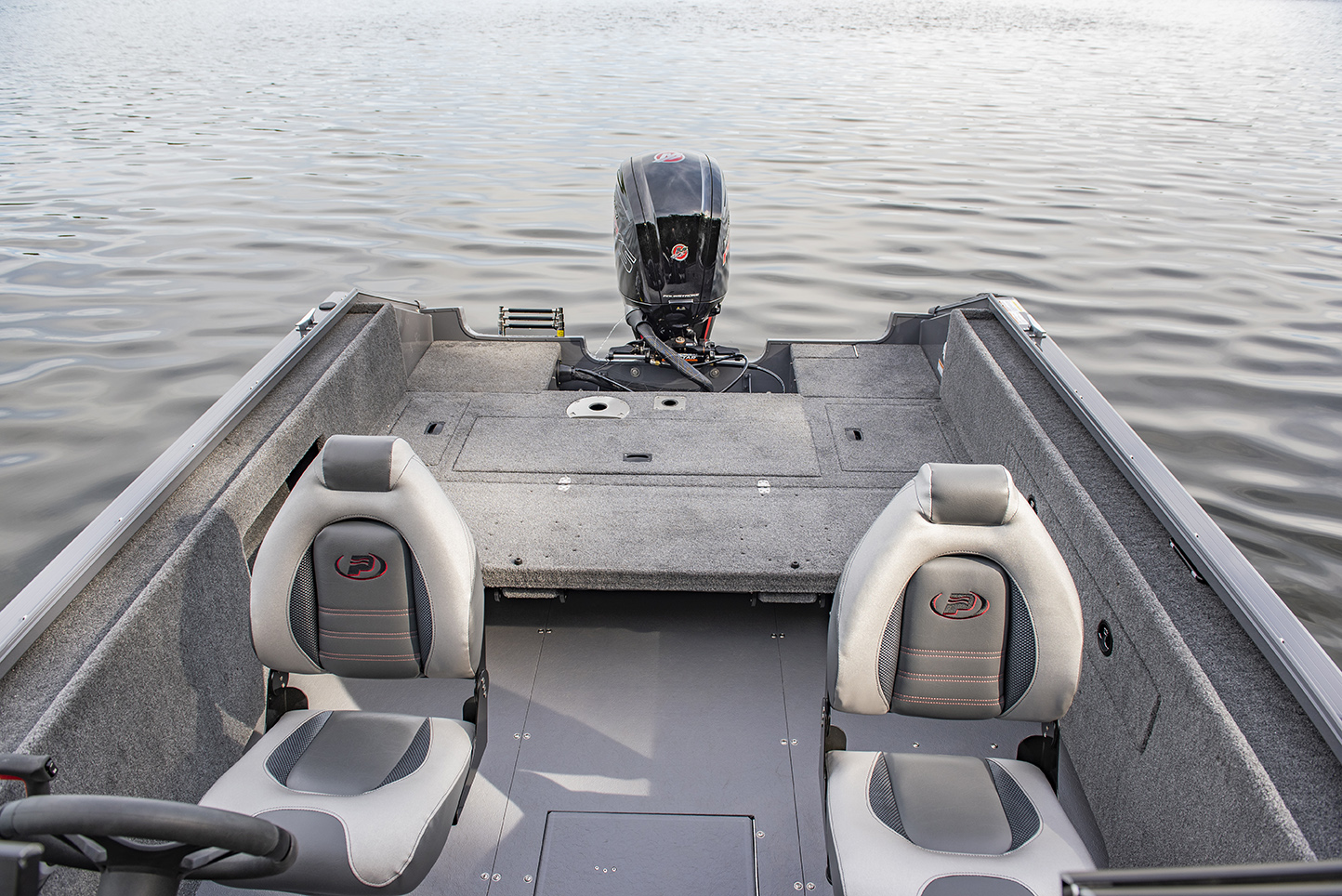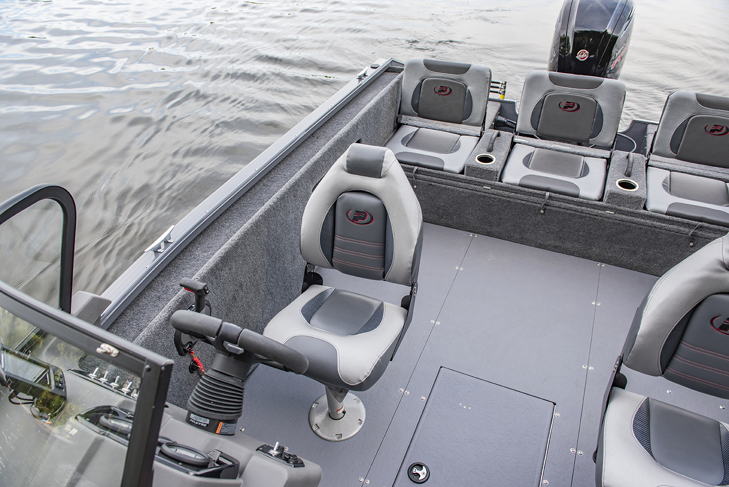 The cockpit floor has a anti-skid vinyl floor and is home to a six-rod holder compartment.  There is also locking gunnel storage on either side of the boat.  Two seat bases come standard in the cockpit, but the floor is conveniently marked if you want your dealer to add an additional two more.  To the aft, the three folding seats are standard.  Fold them all the way down and you can flip over the entire seat base to create a larger casting platform to the aft of the boat.  This is really a cool design that provides space in the cockpit when not fishing but does not limit the space needed when you want to competitively fish. Adorning the entire cockpit is the standard Factory-installed snap fasteners for canvas camper enclosures & mooring top options.