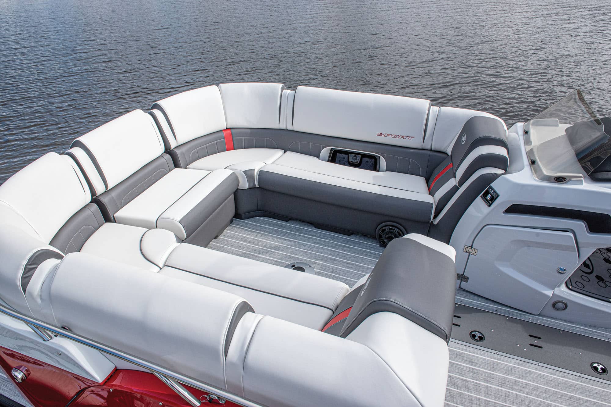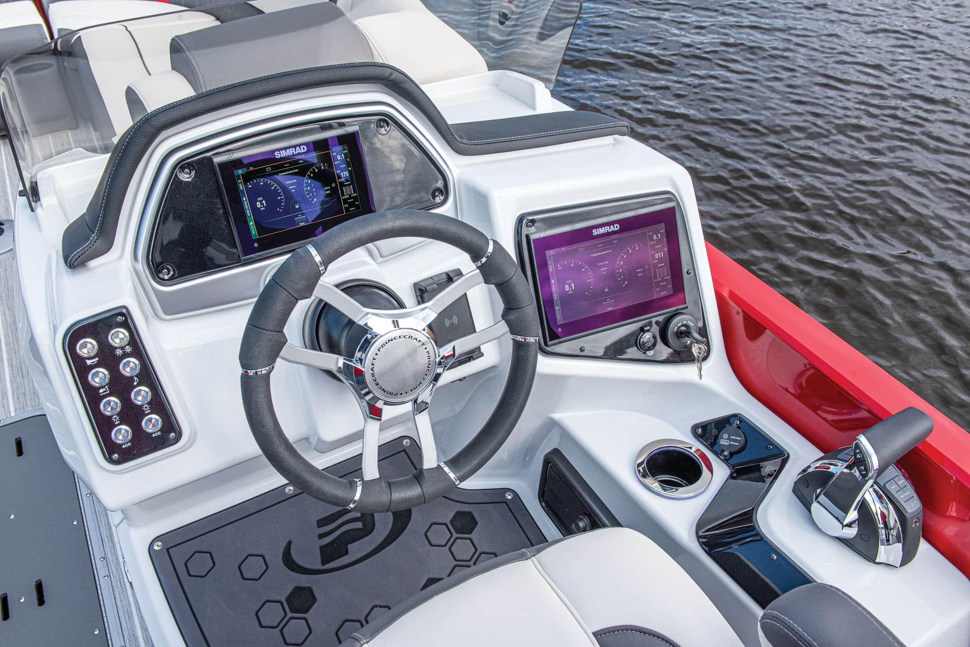 The helm of the Vogue 25 RL is the ultimate jaw dropper. Its stunning set up includes dual SIMRAD displays and gauges, alongside the Mercury SmartThrottle system. A wireless cell phone bracket and holder is located at the right of the steering wheel and integrated accessory switches are across the helm to the left of the steering wheel. With all accessories and trim style in stainless-steel, your go-to spot each day will be the helm of your Princecraft Vogue 25 RL.