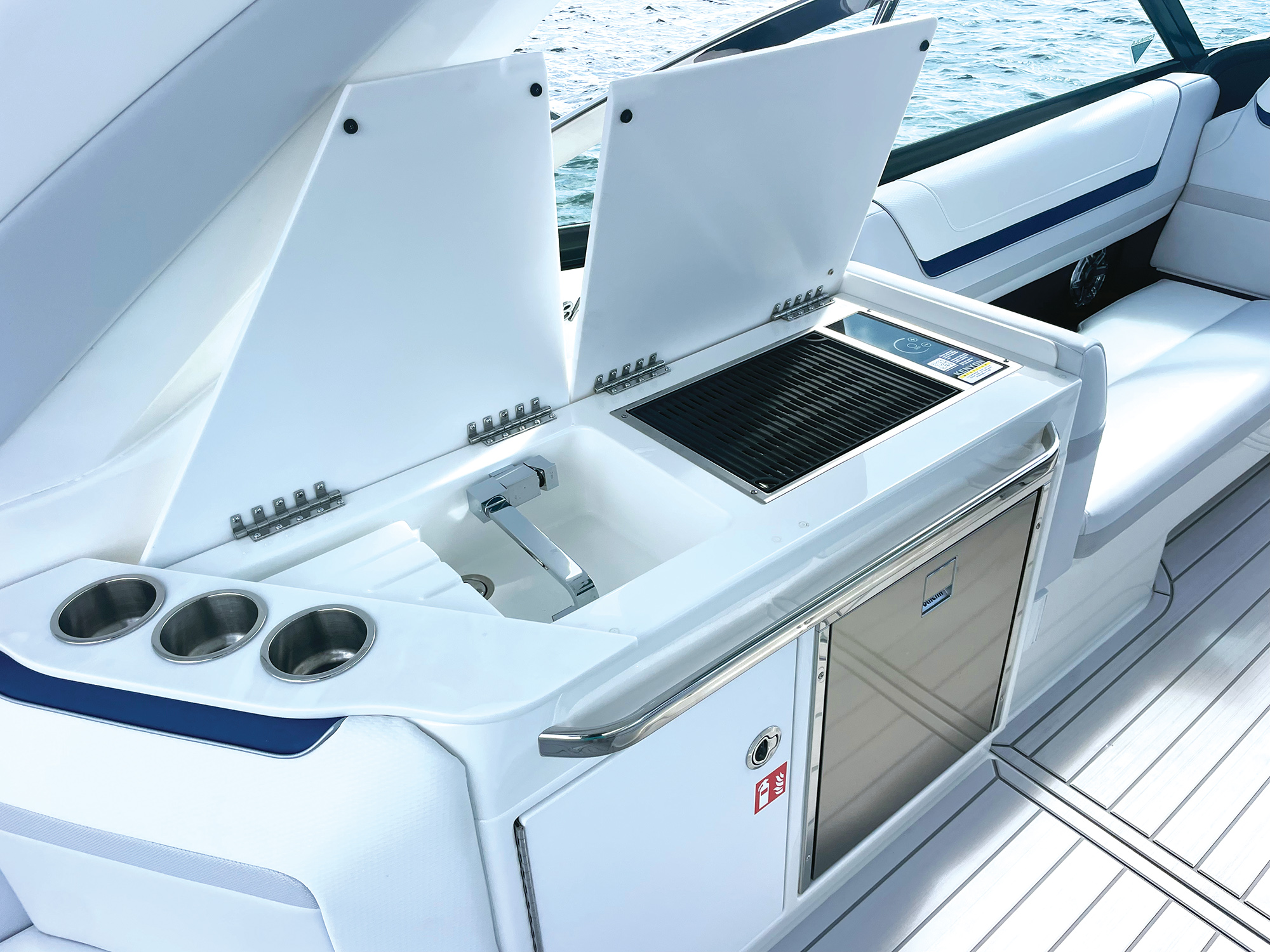 And then there’s the bow—because yes, this is a bowrider. The forward section of the boat isn’t an afterthought; it’s a genuine second lounge space with wraparound seating, a removable table, and deep backrests. Accessed through a wide portside walkway, the bow feels just as much a part of the living space as the cockpit, which is rare in boats this size. There are armrests, drink holders, speakers, and a wind-blocking door that seals off the area when underway.
