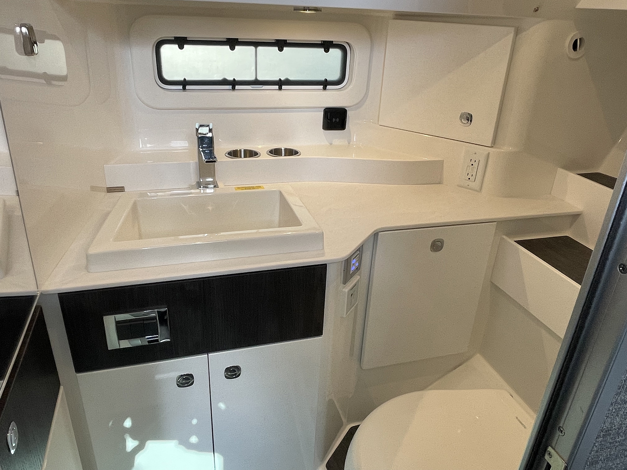 But the real surprise is the aft cabin. Tucked under the helm is a full-beam double berth with a memory foam mattress, reading lights, and privacy curtain. It’s quiet, dark, and cool—everything you’d want in a place to recharge after a long day in the sun. There’s also a full enclosed head with a real shower, sink, and porcelain toilet. No wet head compromises here. You could comfortably spend a weekend aboard, especially with the optional generator and air conditioning package.