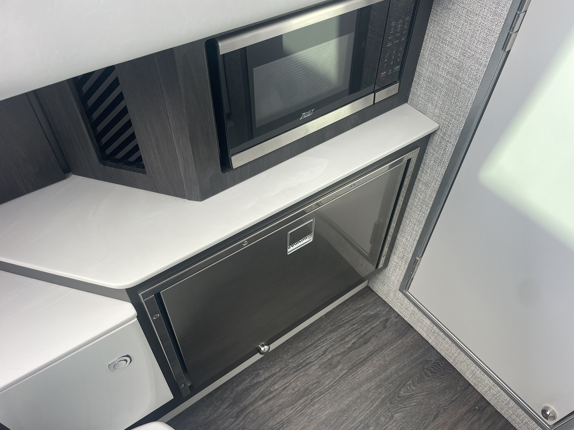 Down below, the 360 CBR delivers more than you might expect. A centerline cabin door leads to a surprisingly spacious interior finished in rich woods and soft upholstery. There’s over six feet of headroom and a sense of warmth that makes the space feel more like a boutique hotel than a boat cabin. The lounge can convert to a berth, there’s a full galley with microwave and refrigerator, and even a cedar-lined closet.