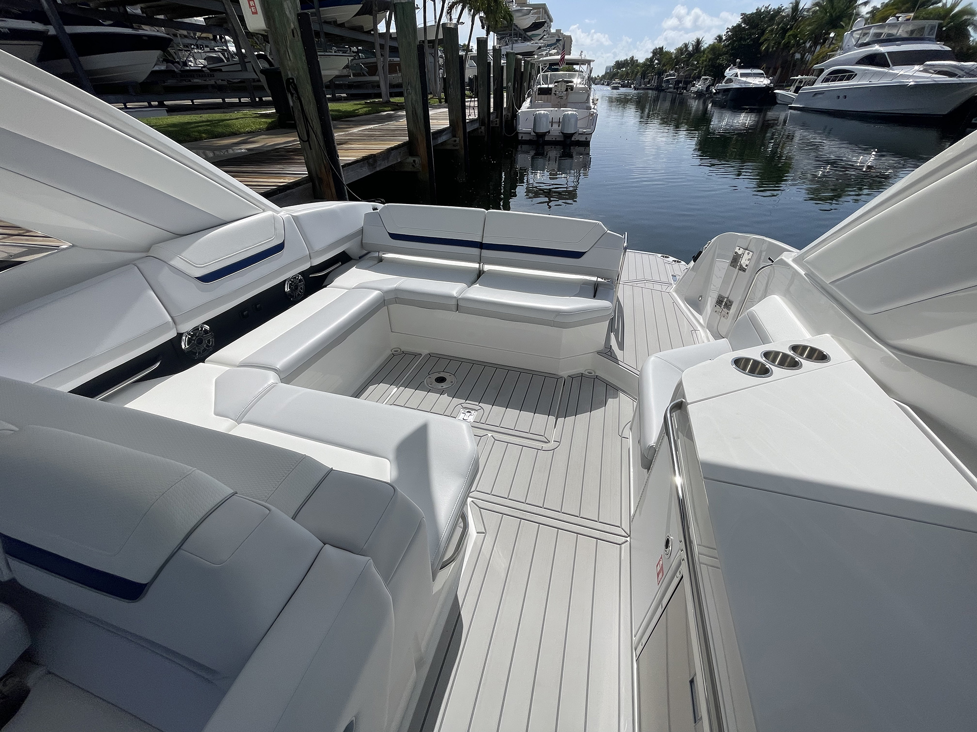 Moving forward, the U-shaped cockpit seating wraps around the port side, offering space for half a dozen guests to sit comfortably. There’s a pair of removable tables here for drinks or dinner, and everything is finished with the kind of attention to detail you expect from Formula—diamond-stitched upholstery, durable woven flooring, and precision stainless hardware.