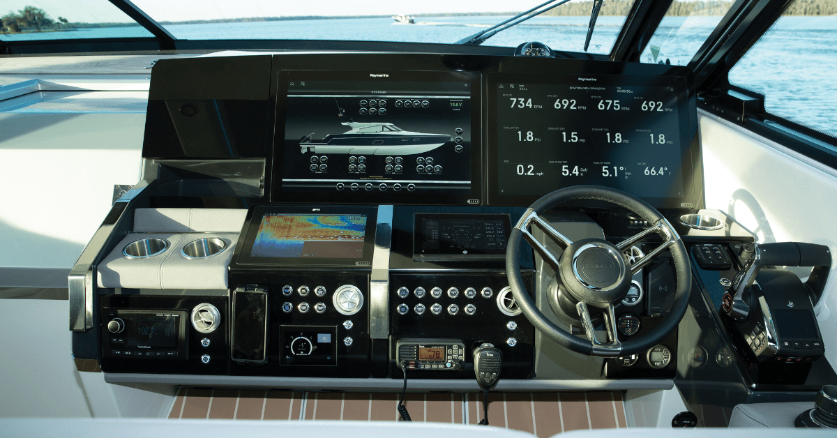 Manning the wheel is sheer pleasure. The dash is state of the art and well organized, reminiscent of a super yacht. Two 24″ Raymarine chart plotters make it easy to see all critical information. The new Mercury Digital Throttle and Shift control allows for smoother and more exact movement and the Mercury joystick allows for effortless and precise docking.