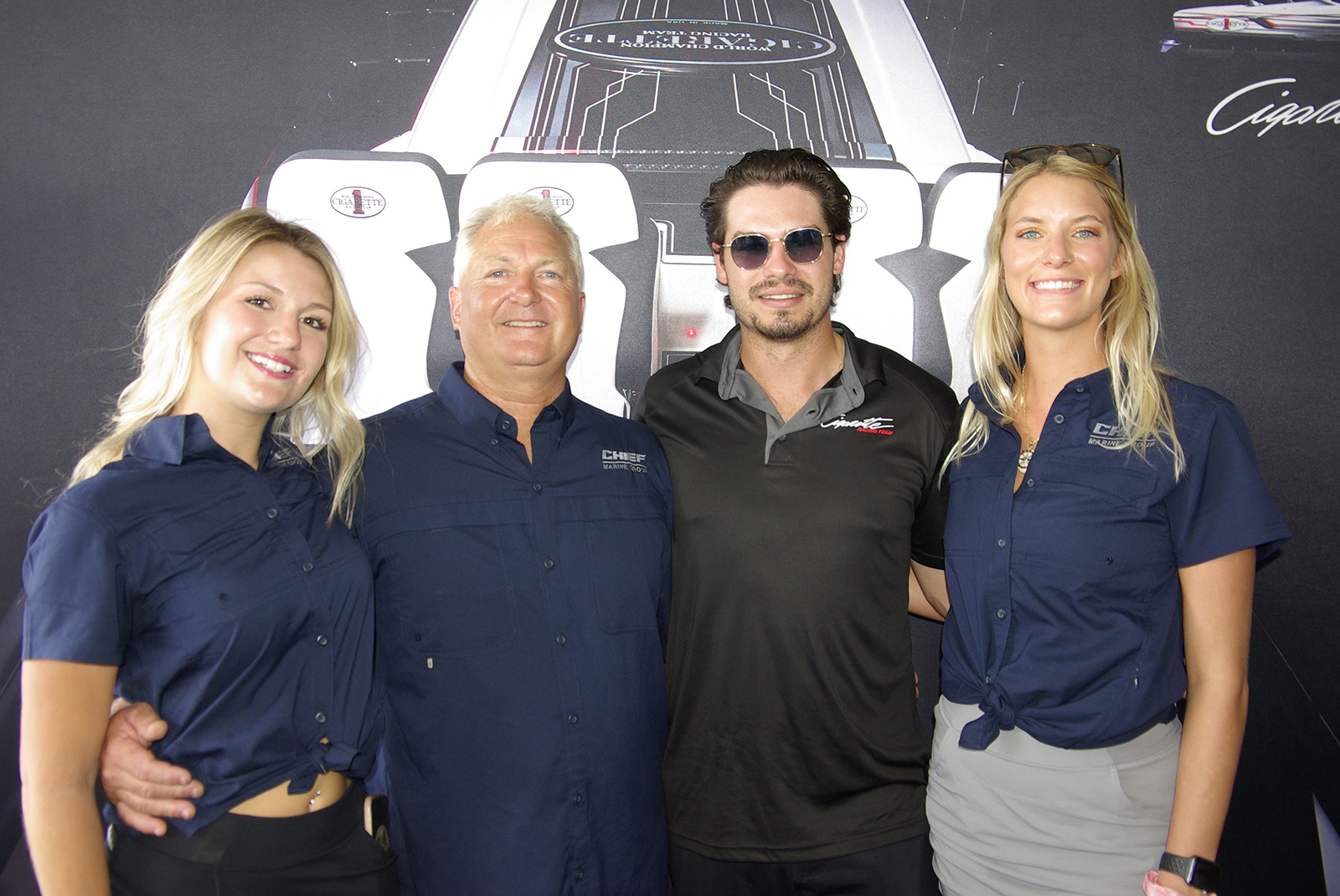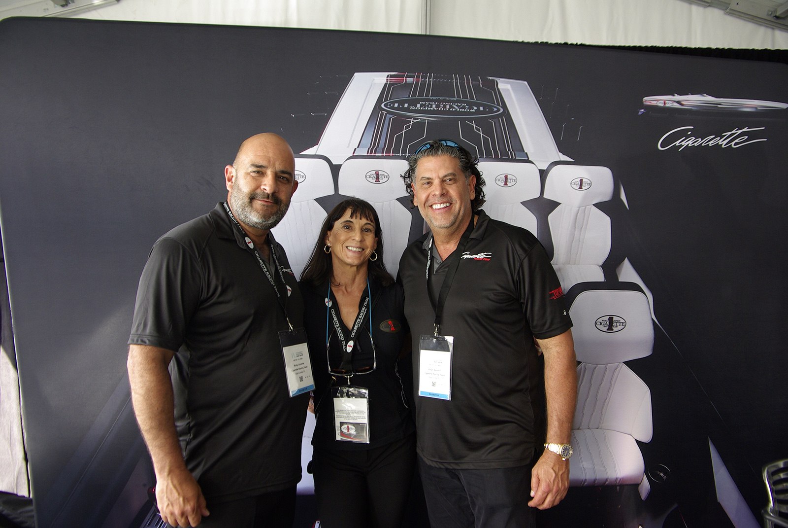 Brand Manager at Cigarette Racing Carlos Ruga (Right) is seen smiling with Tommy Hofstetter (Left) of Chief Marine Group and Morada Cove Marine Destination and his staff.