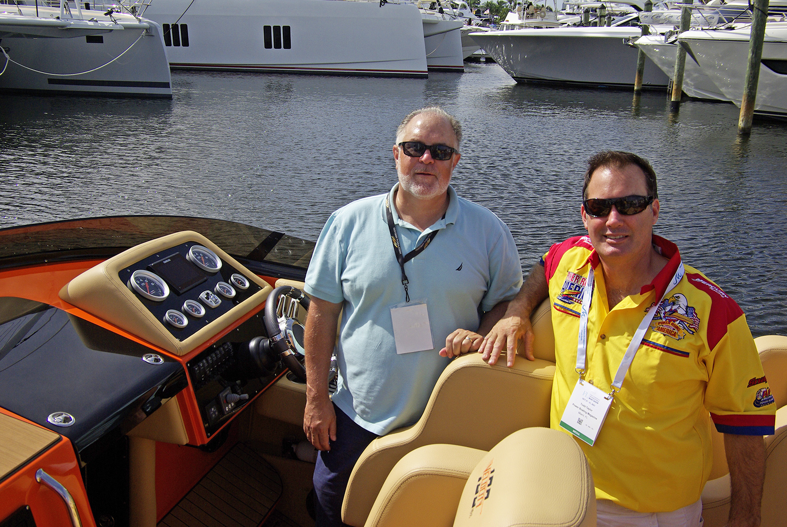 Velocity powerboats had their new 430VRX on display in the water at the Fort Lauderdale International Boat Show. (Top L-R) Vice President of Sales and Marketing Walt Braithwaite shows PBC’s Todd Taylor around the boat.
