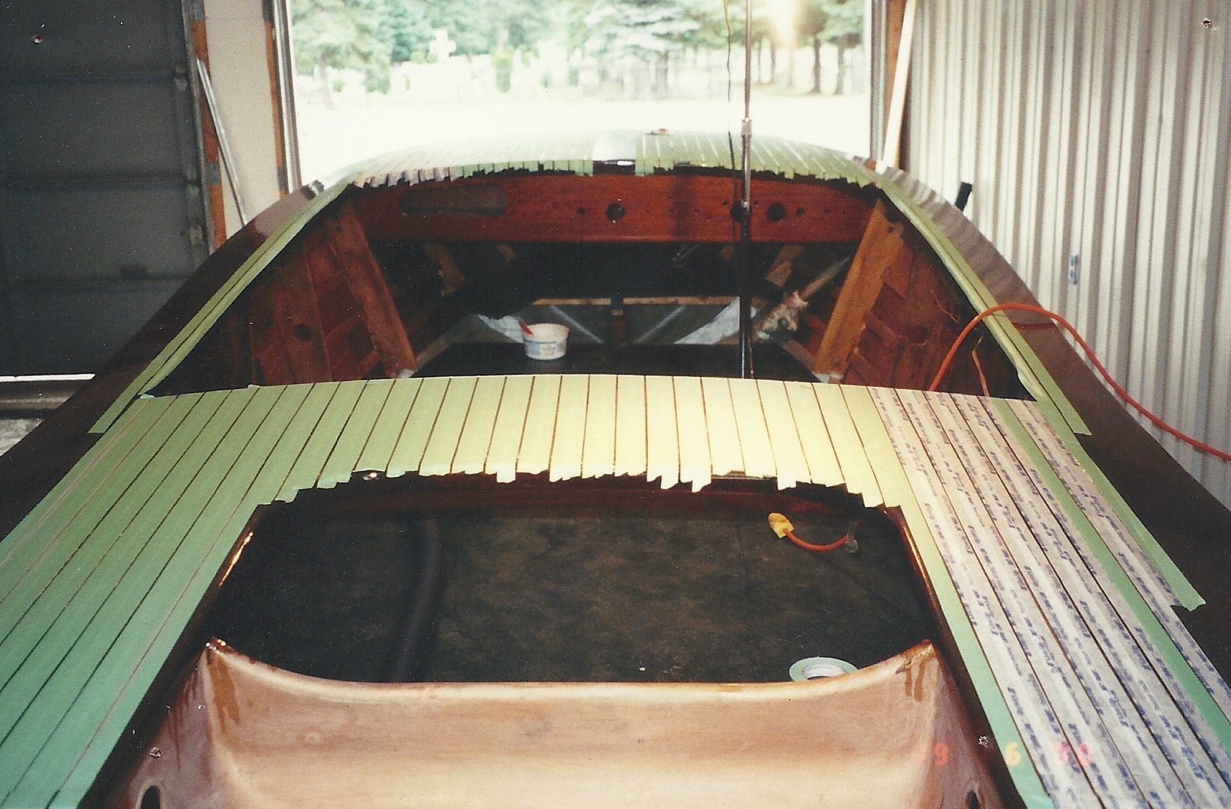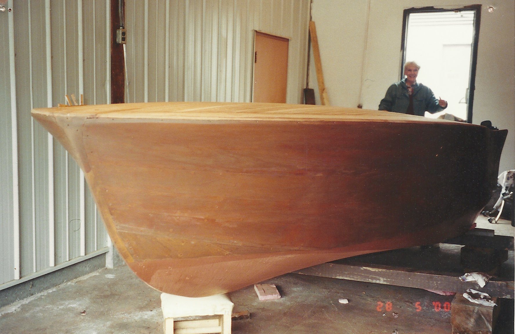 Her finish was rough, with the varnish peeling and cracked, and many boards well dried out from many years of not being in the water. Restoration work began in October of 1999 and proceeded over the winter. The work was done inside at the Muskoka Marine Museum, then located in Huntsville, mostly by John and Janet themselves. The stem was rotten above the waterline and was replaced with the help of Doug McGrath. The entire hull was raised off the trailer and with the help of block and tackle hung from the ceiling, it was turned over and stripped down to the bare mahogany wood. Only three planks in the hull needed replacement, and Mark Robinson assisted with this part. The boards were replaced and all seams filled with Sikaflex, sanded down, and given 12 coats of marine varnish and several coats of anti-fouling paint in “racing copper”.